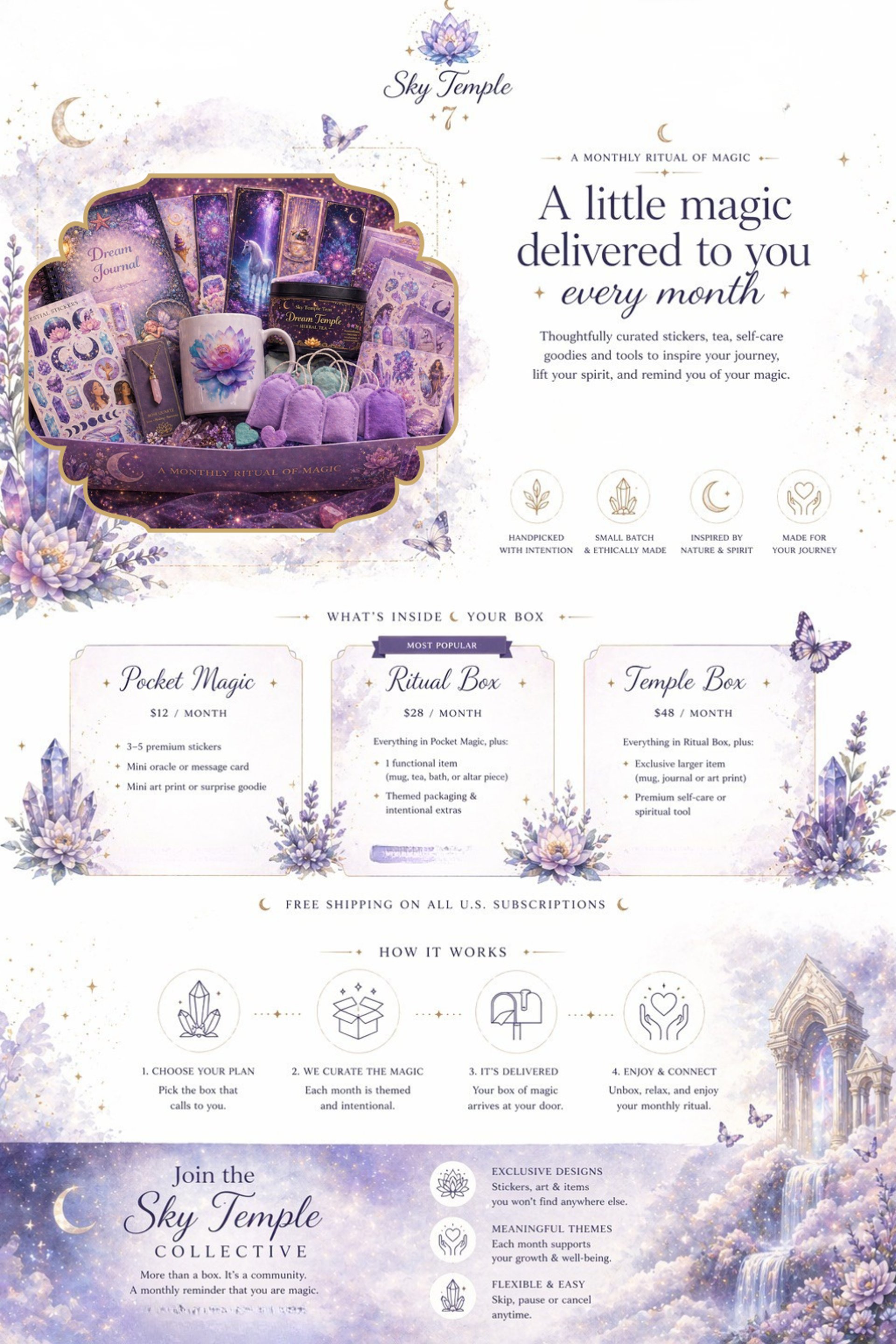 Sky Temple 7's Spiritual subscription boxes are filled with stickers, tea, self care rituals and magical tools to inspire your journey, lift your spirit and remind you of your magic